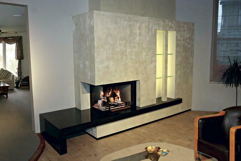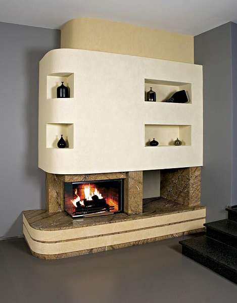 Если симметричные модели выигрывают в эффективности, то асимметричные камины – более эффектны. Этот фактор является одним из определяющих и объясняет, почему, при планировании дизайна, многие специалисты отдают предпочтение асимметричным моделям. В большинстве своем, эти конструкции изготавливают с закрытой топкой прямоугольной формы. Данное исполнение позволяет увеличить размер очага, за горением которого наблюдать можно часами.