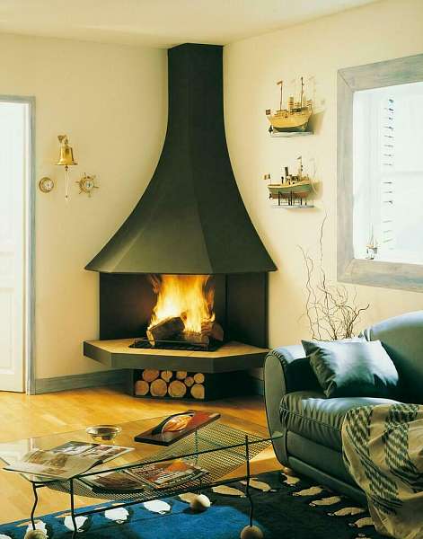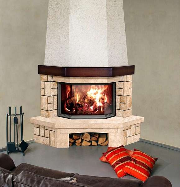 Камин, который расположен в углу комнаты, комплектуется топкой различной конфигурации. Она может быть равноудаленной от стен или располагаться к одной из них ближе. Какой камин лучше: симметричный или асимметричный, зависит от основной цели - нуждаетесь ли вы больше в отоплении или отдаете предпочтение современному дизайну?