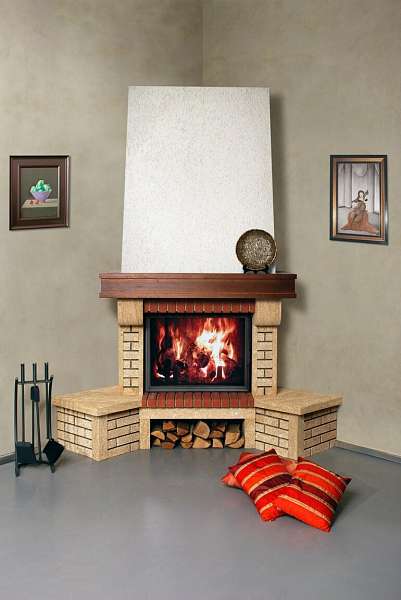 Угловые камины, при размещении в комнате, «съедают» меньше полезной площади. Это делает из оптимальным выбором для установки в небольших комнатах частных домов, дач, а также в городских квартирах.