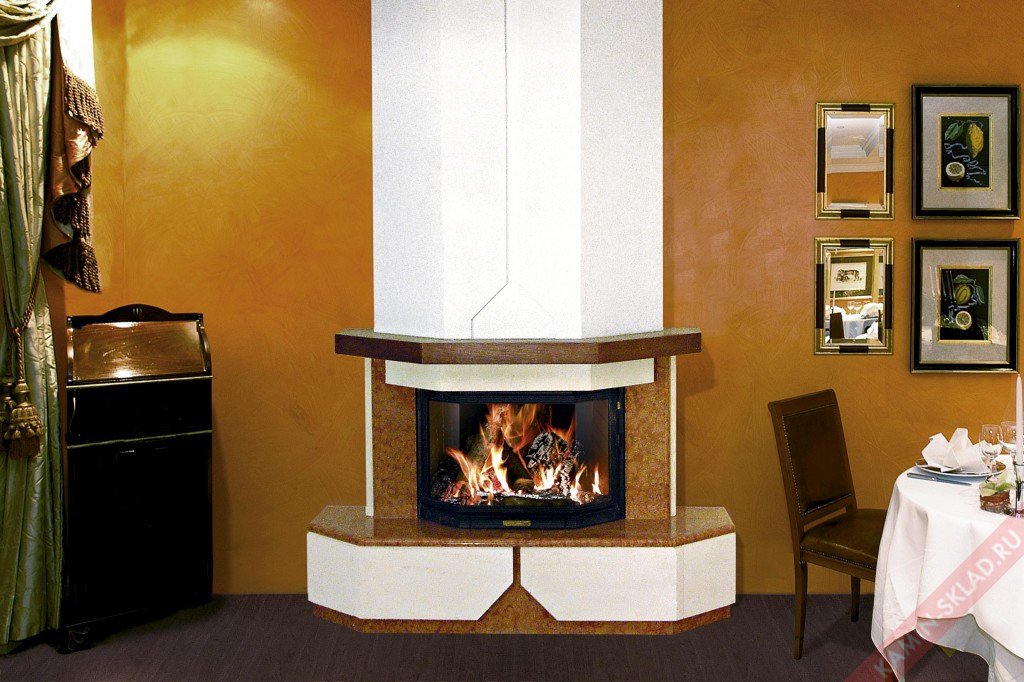 В основу дизайна этого портала ложится все та же Д-образная форма, которая имеет оригинальный внешний вид благодаря трапециевидному выступу. Основная топочная часть камина является плавным продолжением его солидного основания. Здесь нет привычного нижнего отсека для дров, зато есть деревянная полка над топкой и оригинальные вставки.