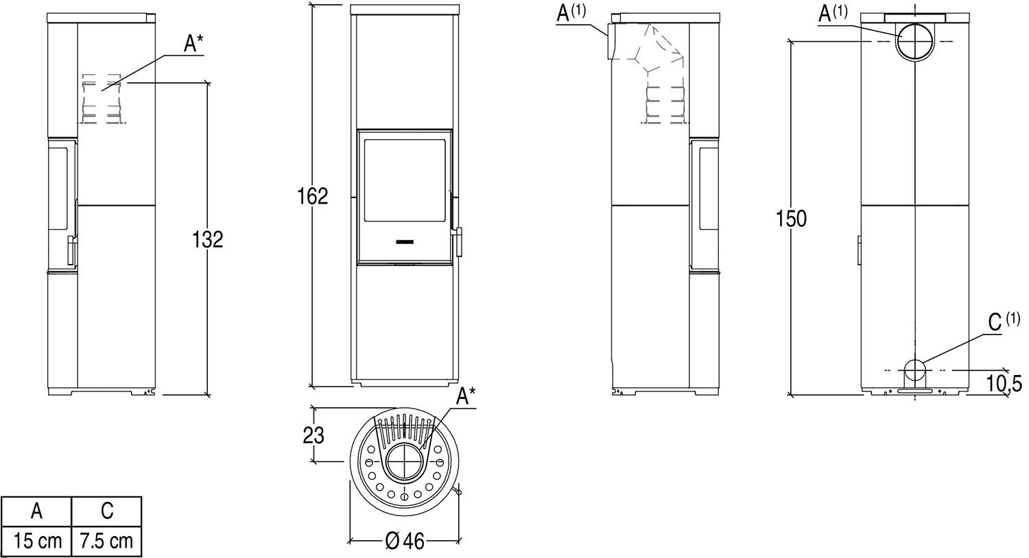 Высота, см 162 Ширина, см 46 Глубина, см 46 Мощность, кВт 7,2 Форма стекла Круглое Материал Сталь+Чугун+Керамика Диаметр дымохода, мм 150 Вес, кг 163 Отапливаемая площадь, кв.м. 75 Духовка Нет -