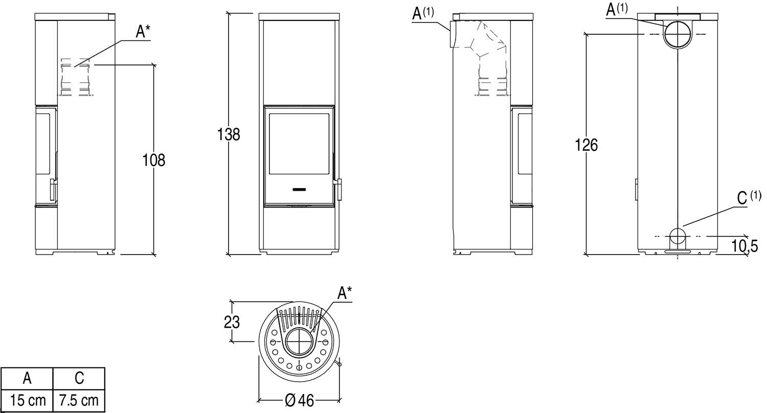 Высота, см 138 Ширина, см 46 Глубина, см 46 Мощность, кВт 7,2 Форма стекла Круглое Материал Сталь+Чугун+Керамика Диаметр дымохода, мм 150 Вес, кг 151 Отапливаемая площадь, кв.м. 75 Духовка Нет -