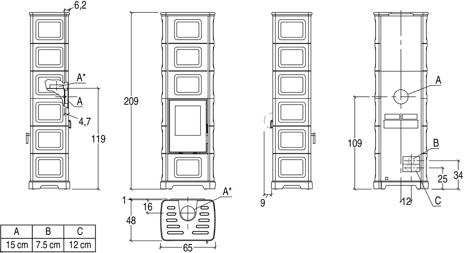 Высота, см 209 Ширина, см 65 Глубина, см 48 Мощность, кВт 5,5 - 11,1 Форма стекла Прямое Материал Сталь+Чугун+Керамика Диаметр дымохода, мм 150 Вес, кг 310 Отапливаемая площадь, кв.м. 90 Духовка Нет -